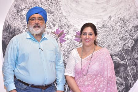 Visitors to the opening explored works that move between figuration and symbolic abstraction. Bharti Verma’s paintings reflect an inward gaze, where the human form becomes a site of memory, emotion, and introspection. In contrast, Ruchi Chadha’s lotus-inspired compositions evoke themes of renewal and quiet strength, using the flower as a metaphor for growth and emergence.